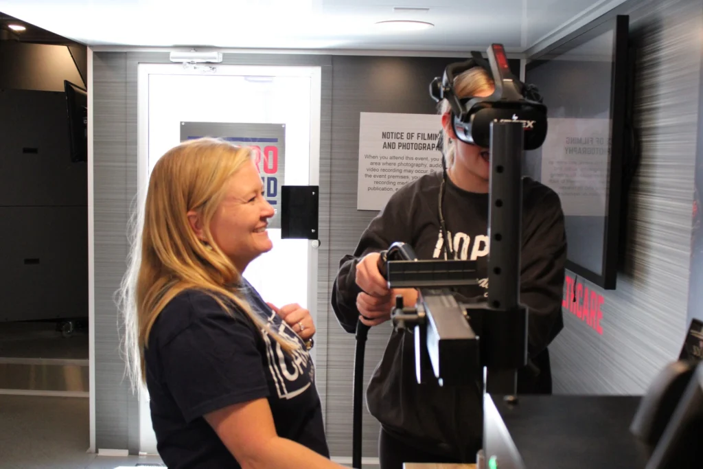 The mobile workshop contains 12 hands-on simulations in the industries of construction, transportation, manufacturing, utility work, and health care. Virtual reality headsets were used in the forklift, welding, and lineman bucket scenarios, providing students with a more realistic experience.